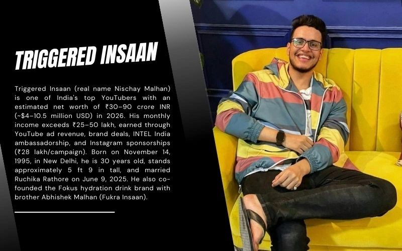 Triggered Insaan (real name Nischay Malhan) is one of India’s biggest YouTubers with an estimated net worth of ₹30–89 crore (~$3.5–10.4 million USD) in 2026. His monthly income ranges from ₹25–50 lakh, earned through YouTube ad revenue across 35M+ combined subscribers, Intel India brand ambassadorship, and Instagram sponsorships of ₹28 lakh per campaign. Born November 14, 1995 in New Delhi, he is 30 years old, stands 6’1″ tall, and married Ruchika Rathore on June 9, 2025. He also co-founded the Fokus hydration drink brand with brother Abhishek Malhan (Fukra Insaan) in February 2025.